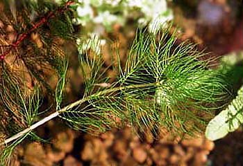 | [アリノトウグサ科フサモ属] 沈水性の多年草です。茎は濃い緑色のはずなのですが山中湖のものは何故か赤く、写真の左上の角に少し見えます。採取して水槽で育成していますと緑色に変化します。たぶん水質の関係かと思っていますが確認はしていません。 この草は枝の途中から脇目を出し増殖します。水槽では成長が早くトリミングが面倒です。オオフサモほどではありませんが寒さにはかなり強いようです。漢字名は房藻。仲間にホザキノフサモ、オグラノフサモがあります。 |
